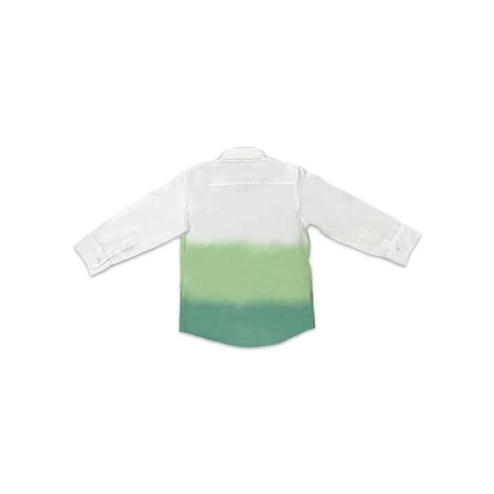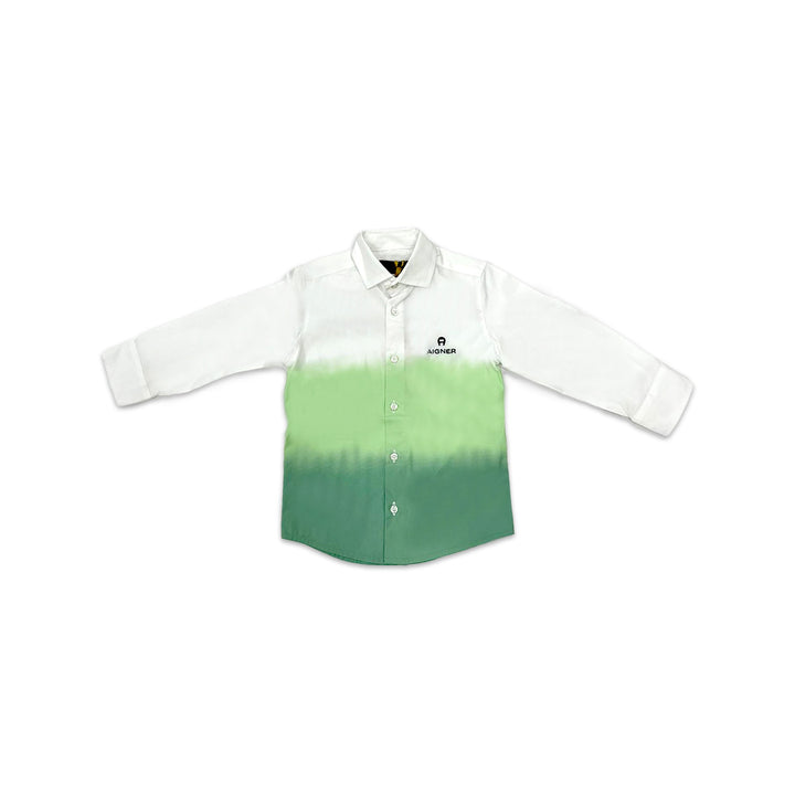 White and green tie-dye shirt for baby boys by AIGNER, made in smooth cotton poplin. It has the designer's signature 'A' horseshoe logo embroidered on the chest in navy blue. There are branded button fastenings down the front, and a small logo tab sewn on the side.