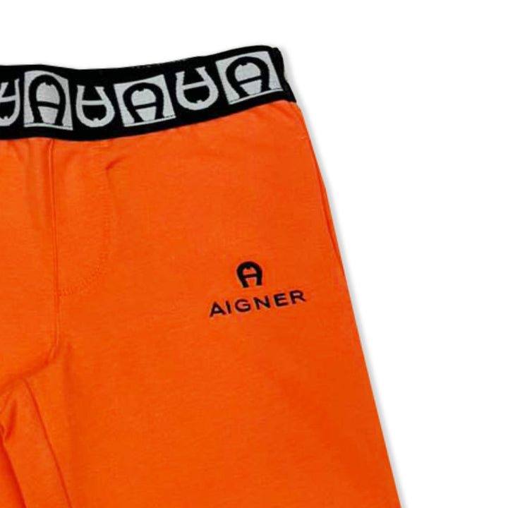 Orange shorts for boys by AIGNER, made in a soft and stretchy cotton jersey. In a casual design, they have useful side seam pockets and a comfortable logo jacquard elasticated waistband. The brand's signature 'A' horseshoe logo is embroidered on one leg, for extra designer appeal.