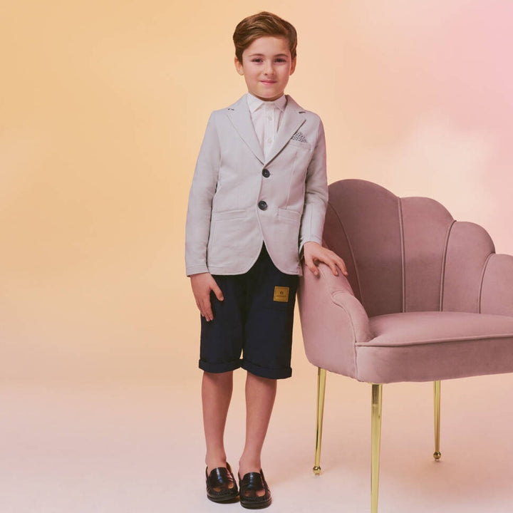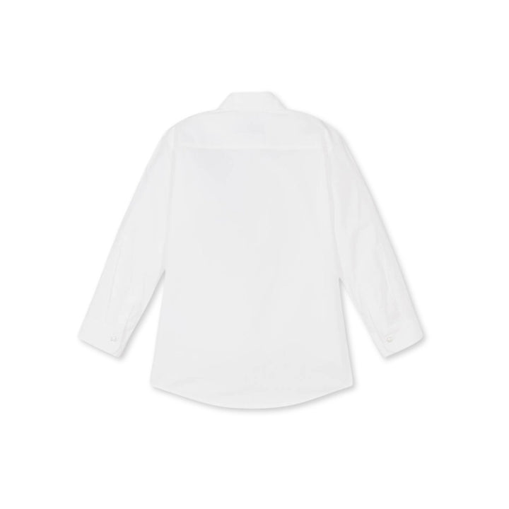 White cotton long-sleeved shirt for boys by German label Aigner, ideal for smart-casual days. It is made in comfortable, lightweight poplin, with a beige and white circular design on one side and signature 'A' horseshoe logo in the centre. It fastens with branded buttons on the front and cuffs.