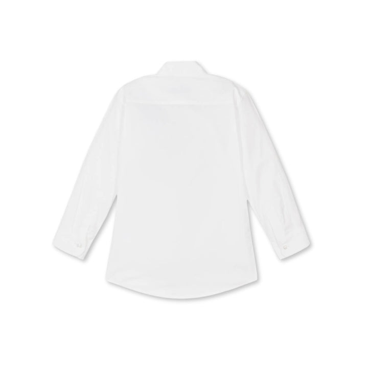 White cotton long-sleeved shirt for boys by German label Aigner, ideal for smart-casual days. It is made in comfortable, lightweight poplin, with a blue and white circular design on one side and signature 'A' horseshoe logo in the centre. It fastens with branded buttons on the front and cuffs.