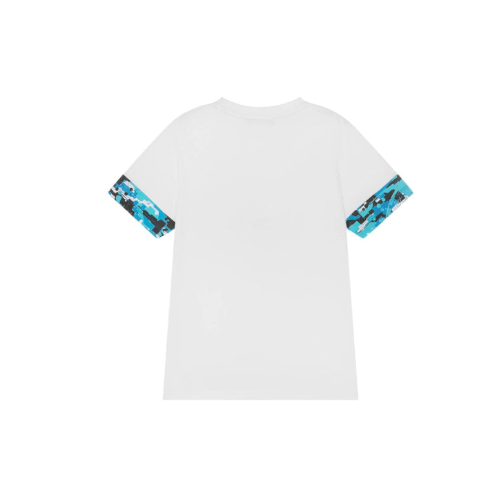 A cool white T-shirt for teen boys from AIGNER. It is made in soft cotton jersey, with a black and blue paint splatter design on the sleeves and patch pocket. The designer's name is embroidered on the chest for an extra branded touch
