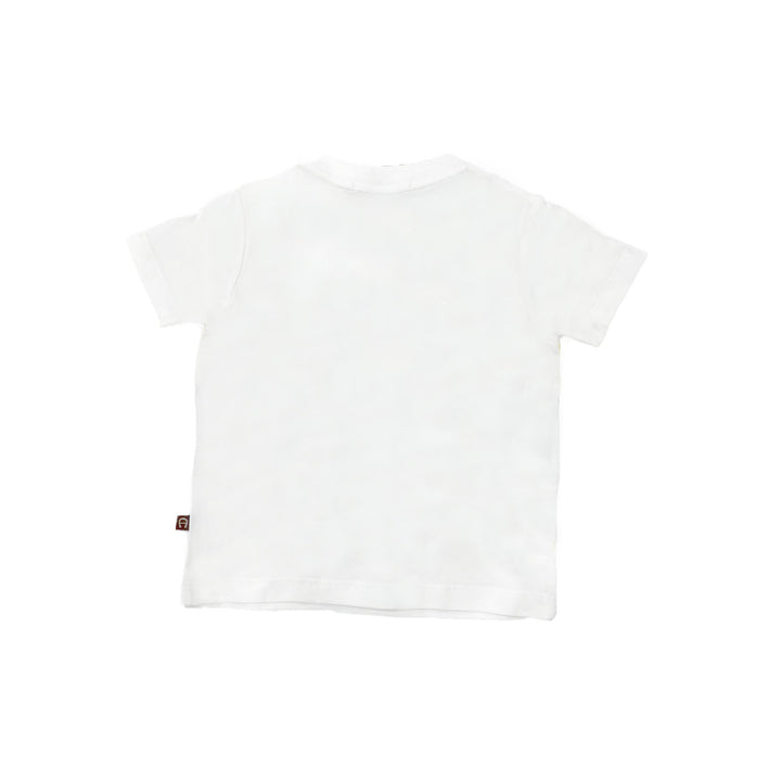 Boys white crew neck T-shirt by AIGNER, made in soft cotton jersey. Fastening with poppers on one shoulder, it has a yellow and blue paint splatter stripe across the front with a rubberised signature 'A' horseshoe logo patch.