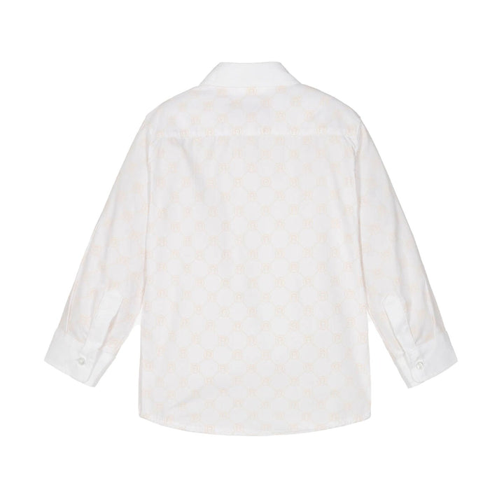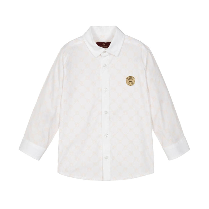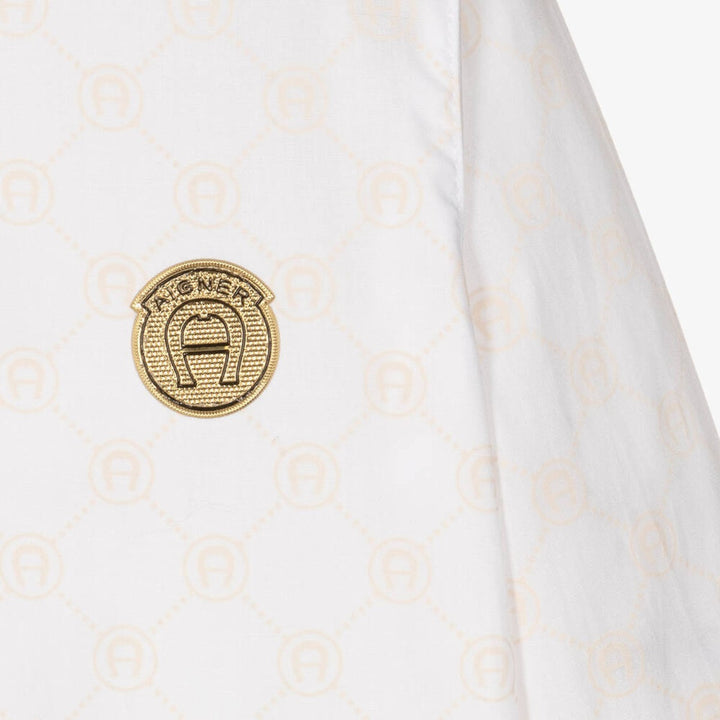 White shirt for boys by AIGNER, made from lightweight and breathable cotton. Subtly printed with an all-over monogram pattern in beige, this shirt has the House's signature 'A' horseshoe logo in gold on the chest. The branded front button fastenings give a smart and classic finish.