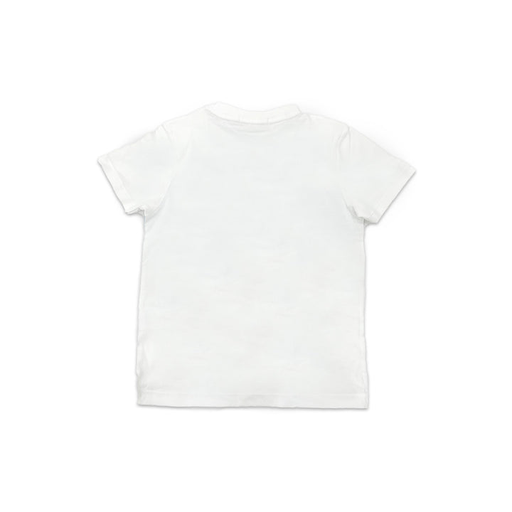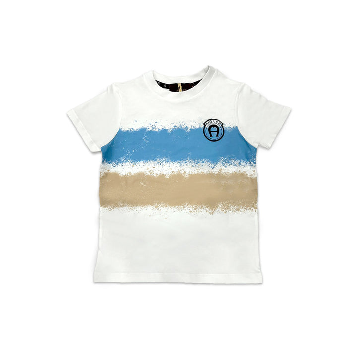 White logo t-shirt for boys by German designer Aigner. Made from soft cotton, it features a blue and beige paint design across the front and it has brands iconic horseshoe logo embroidered in navy on one side.