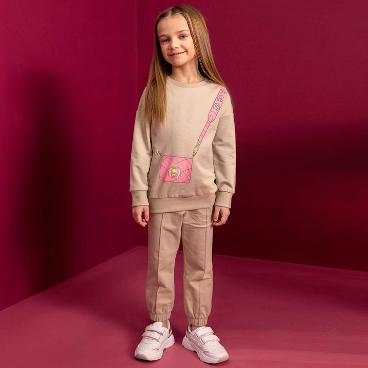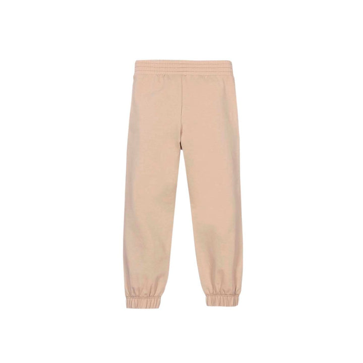 Beige joggers for girls by AIGNER, made in soft cosy cotton jersey. They have front seam detailing, with the brand's signature 'A' horseshoe logo embroidered in pink on one side. There are slanted front pockets, and the waist and ankle cuffs are gently elasticated for a relaxed comfortable wear.