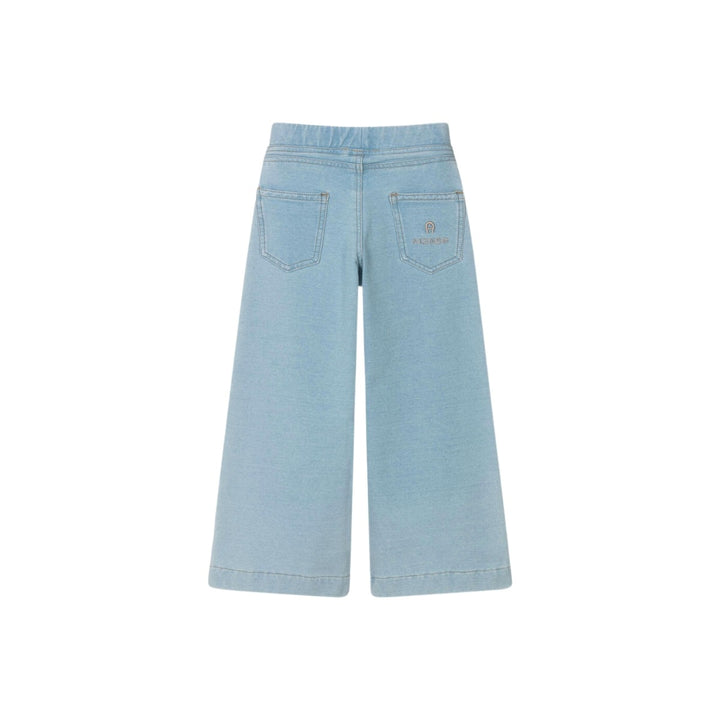 Girls pale blue wide leg trousers by German brand AIGNER, made in super soft cotton jersey with the look of denim. Comfortable to wear, they have a stretchy elasticated waistband for a great fit. There are faux pockets on the front and two functional back pockets with signature 'A' horseshoe embroidery for a branded look.