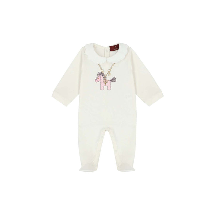 Ivory Pima cotton babysuit for girls by luxury designer AIGNER, made in super soft jersey. Designed to look like a necklace, there is a gold chain and horse print, patterned with the brand's signature 'A' horseshoe logo in pink and ivory. It features a white scallop trimmed collar with popper fastenings on the back and between the legs, for comfort and easy dressing.