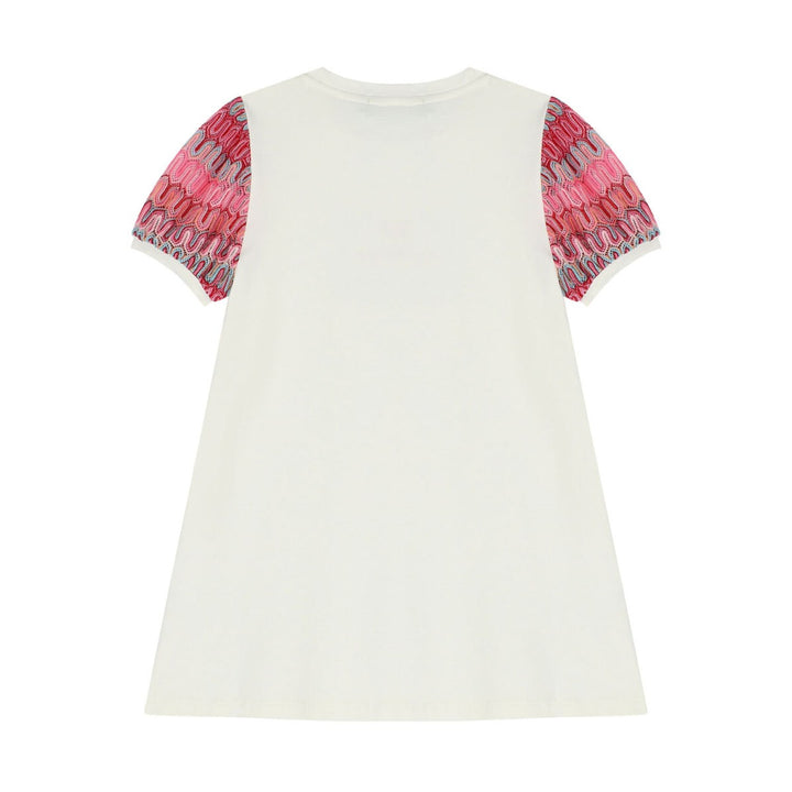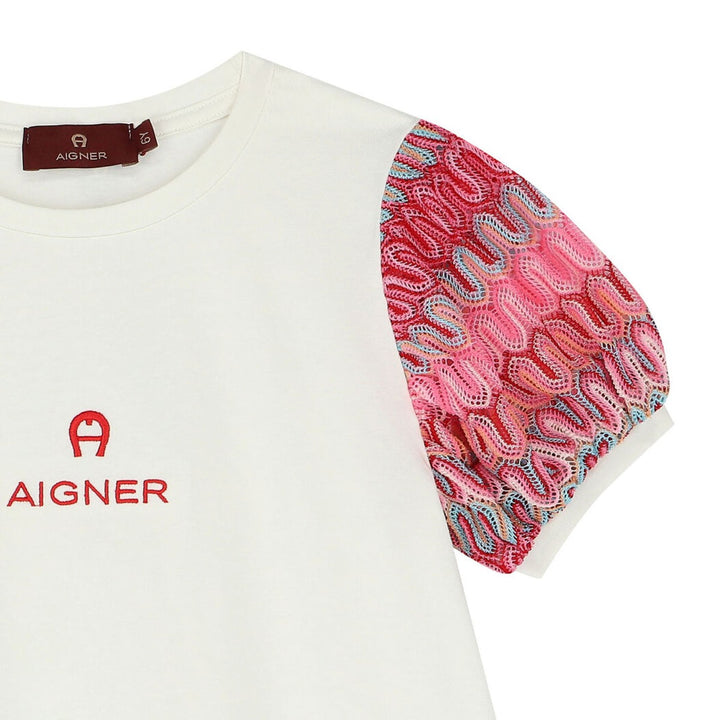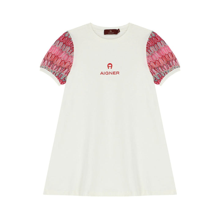 Ivory cotton dress for girls by AIGNER. Beautiful crochet lace puff sleeves give a fun twist to this casual jersey dress without compromising on comfort. The signature 'A' horseshoe logo is embroidered on the front in red alongside the brand name for a designer finish.