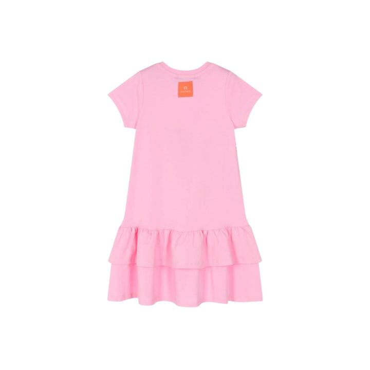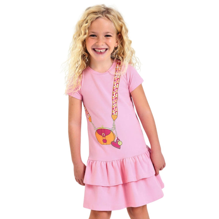 Pretty pink dress for girls by AIGNER, made in soft cotton jersey for comfort. It has a cute trompe l'oeil handbag print on the front in pink, orange and gold colours for a girly look. The dropped waist creates a pretty, feminine silhouette and there are cute, capped sleeves. The bright orange logo badge on the back of the neck adds a branded touch.