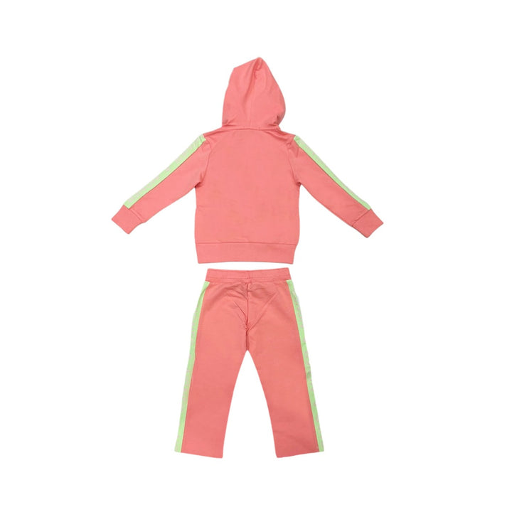 Pink logo tracksuit set for girls by Aigner Kids. Made from soft cotton, the zip up top has the brand's iconic horseshoe embroidered in pink on the chest it front zip pocket. It fasten with a zip on the front. Matching with a pink joggers and logo on the front. An elasticated waistband for comfortable fit. Both has a green trim and pink logo tape.