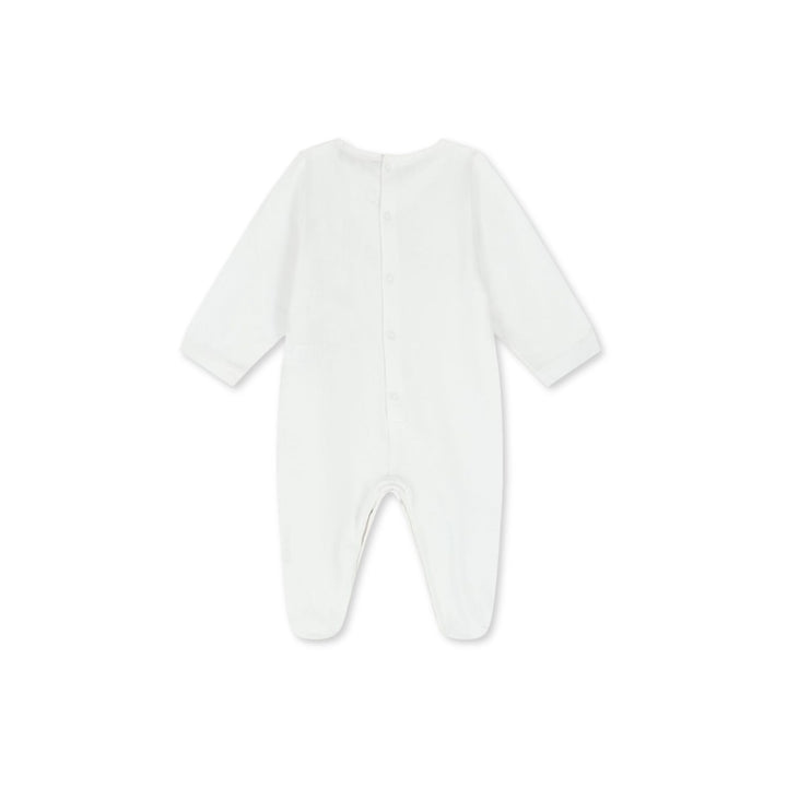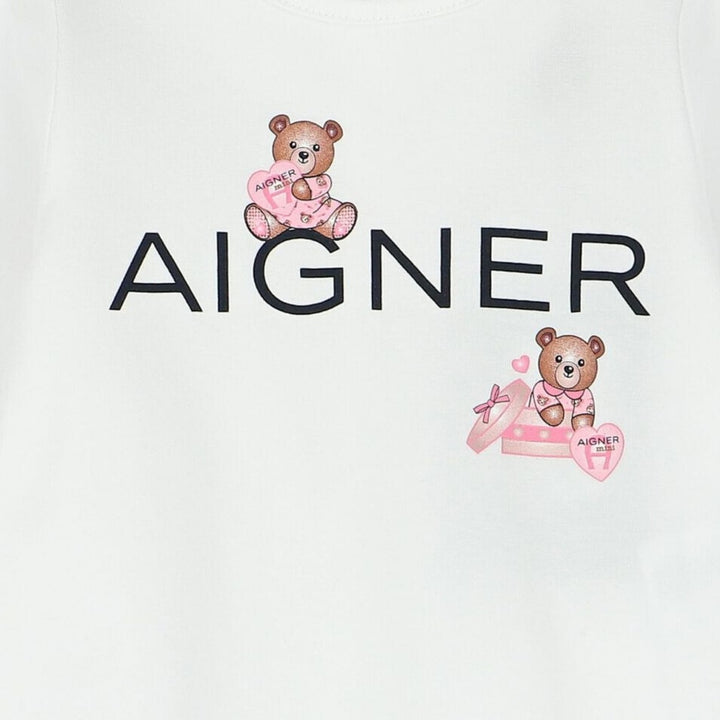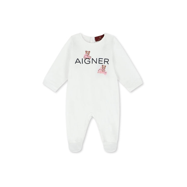 A white babygrow for girls by AIGNER, made from soft and stretchy Pima cotton jersey. It has a black logo print on the front with sweet teddy bears. Poppers fasten on the back and between the legs for easier baby changing.