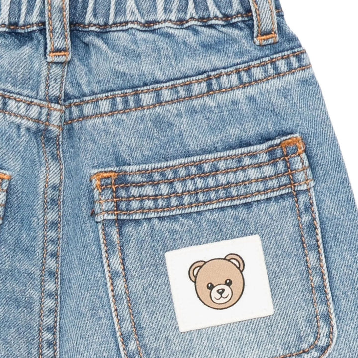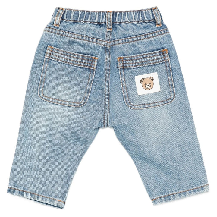 These Moschino baby jeans bring a designer edge to everyday wear. Crafted from soft yet durable denim, they feature the brands embroidered logo for a subtle luxury touch.