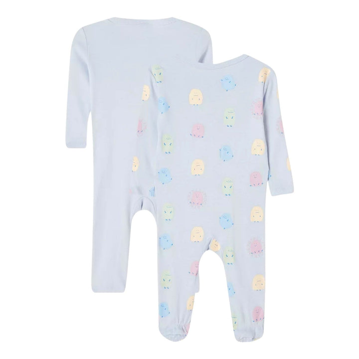 Set of two blue rompers featuring a stylish logo print, made from 100% soft cotton for all-day comfort and breathability.