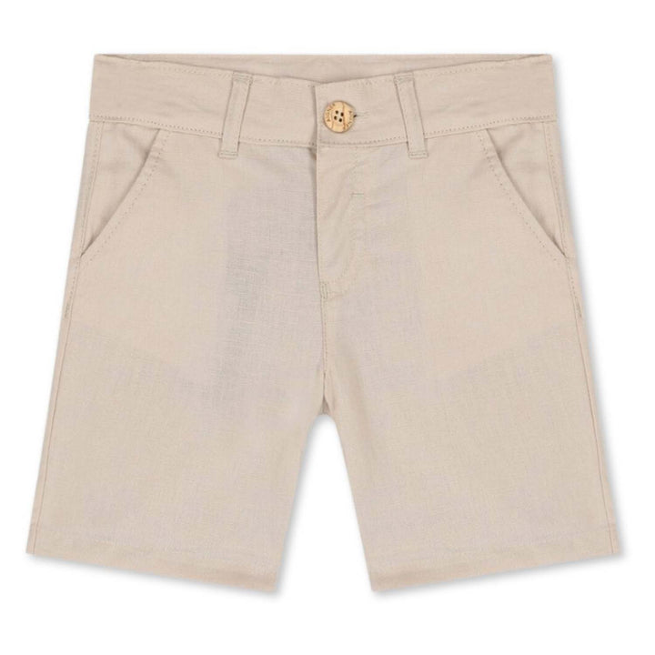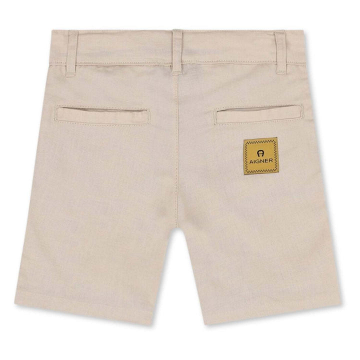 Beige shorts for boys by German designer Aigner. Made from soft cotton, it features the brands logo patch at the back. They have a four pocket styling and a comfortable adjustable waist and concealed zipper fly with top button closure.