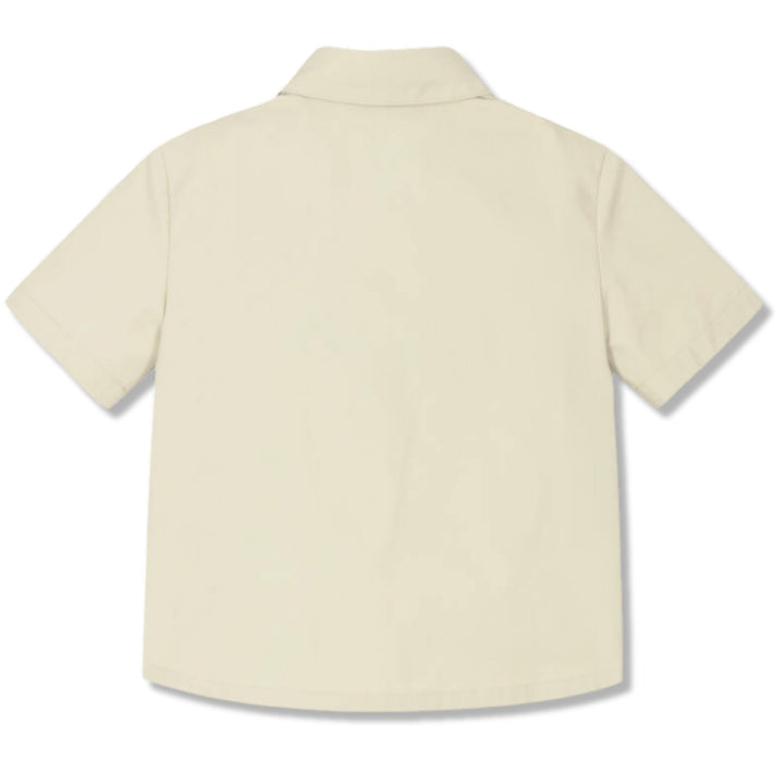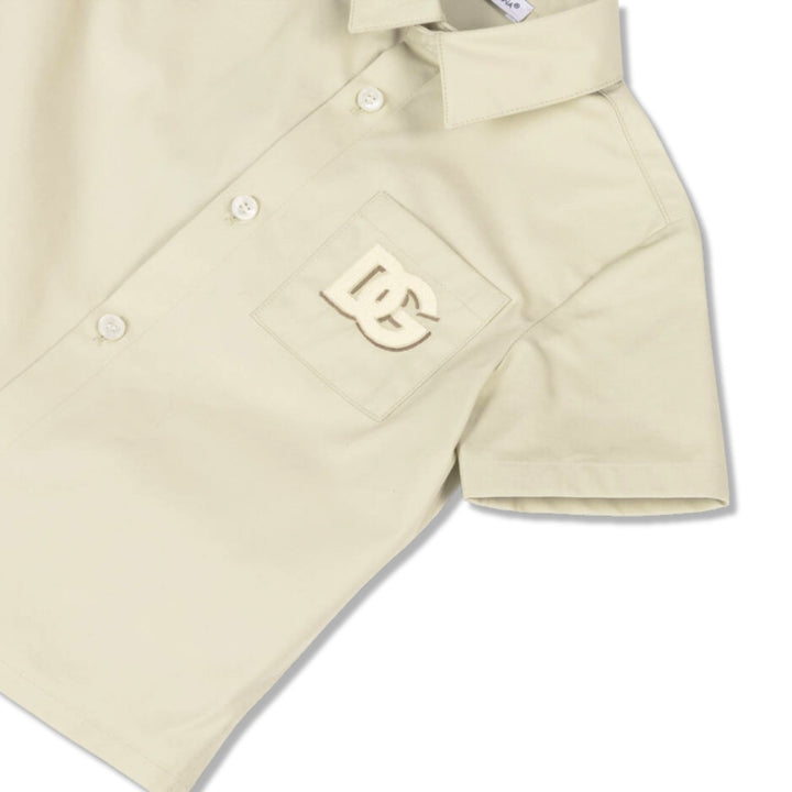 Beige short-sleeved shirt for baby boys by luxury Italian label, Dolce & Gabbana, ideal for both casual and semi-formal occasions. Made from cotton gabardine for a more structured look, it features a classic collar and the brands distinctive crossover DG logo on the chest pocket.