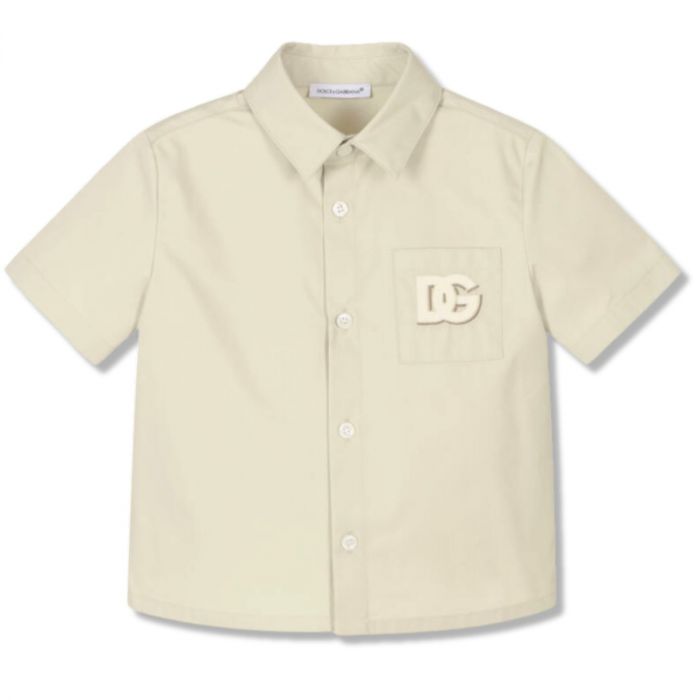 Beige short-sleeved shirt for baby boys by luxury Italian label, Dolce & Gabbana, ideal for both casual and semi-formal occasions. Made from cotton gabardine for a more structured look, it features a classic collar and the brands distinctive crossover DG logo on the chest pocket.