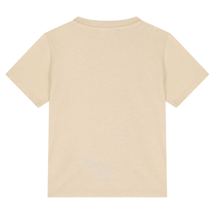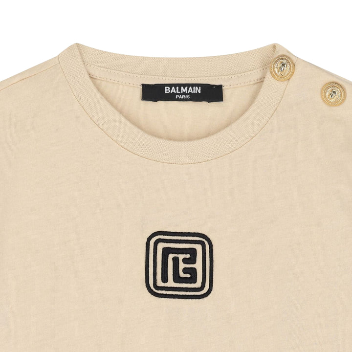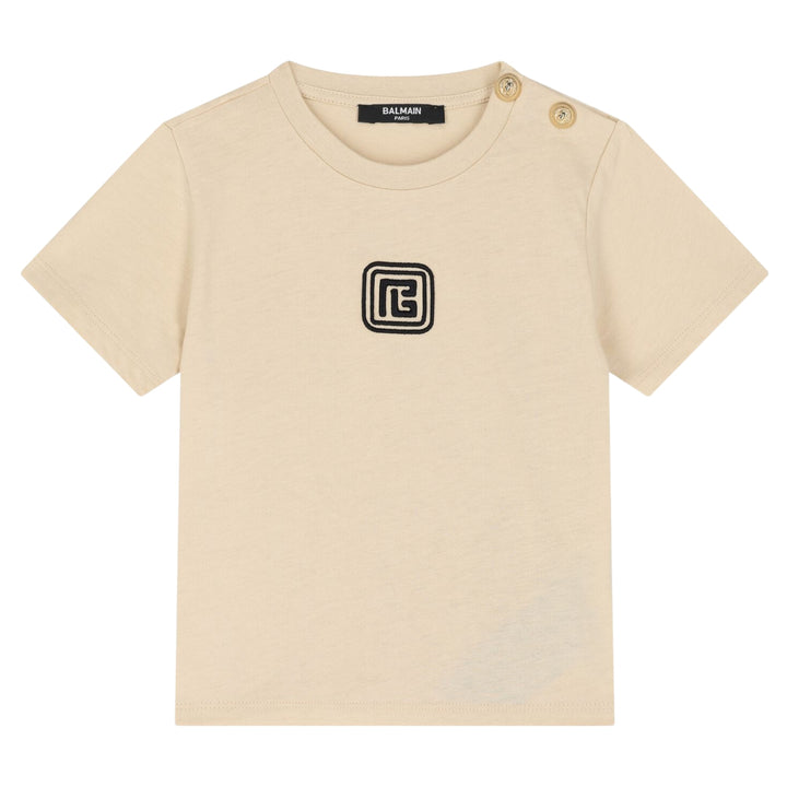 Baby Boy Beige T-shirt with logo embroidery, crew neck, short sleeves, and press-stud fastening at the shoulder.