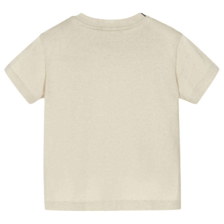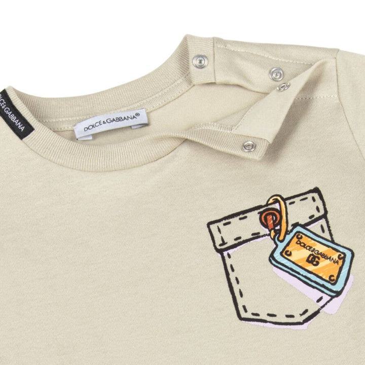 Beige T-shirt for little boys by luxury Italian brand, Dolce & Gabbana, made in soft cotton jersey for comfortable wear. A graphic pocket printed with the iconic branded tag adds an element of fun and designer flair to this casual tee. There are discreet popper fastenings on one shoulder for easy dressing.