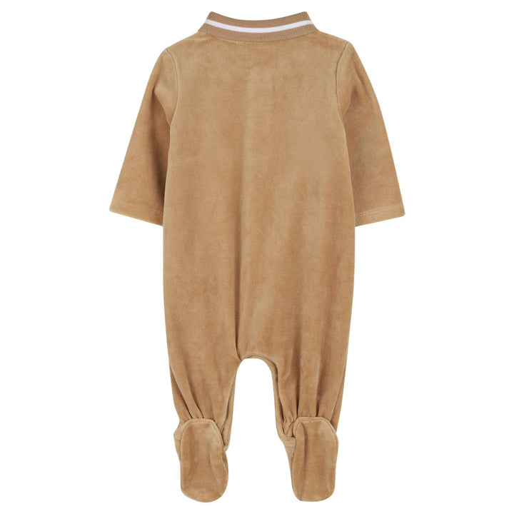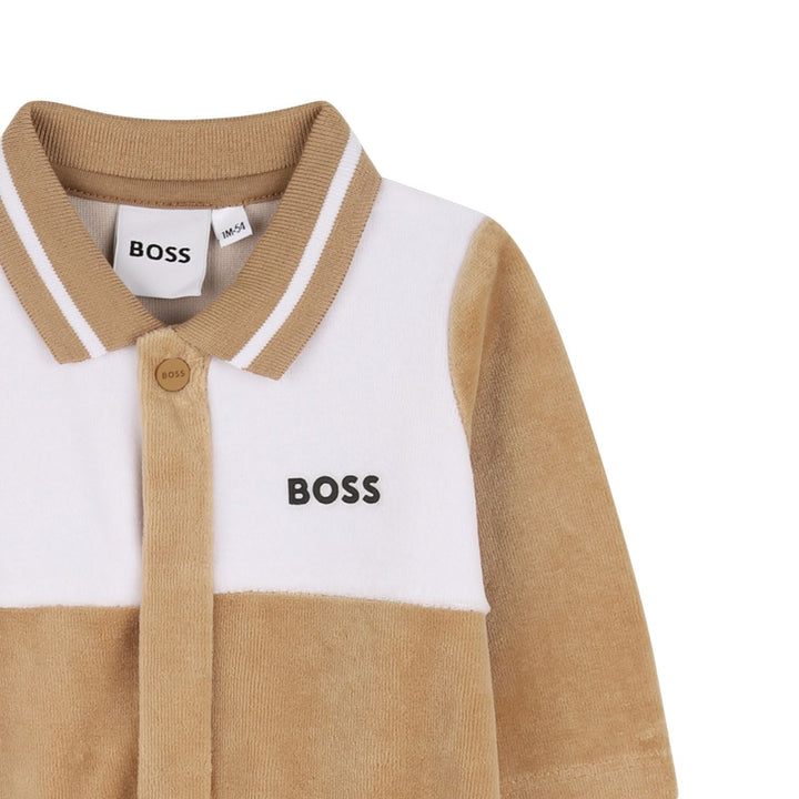 Boys beige and white velour romper by BOSS, with a wonderfully soft, luxurious feel. Ideal for keeping your little one cosy during the cooler months, it has a ribbed collar and concealed front poppers for easy dressing. The brand's logo is printed on