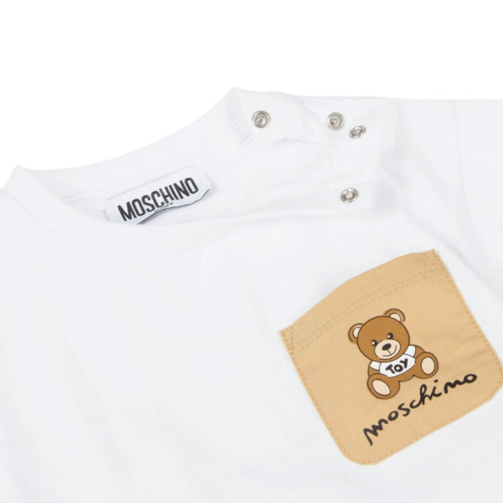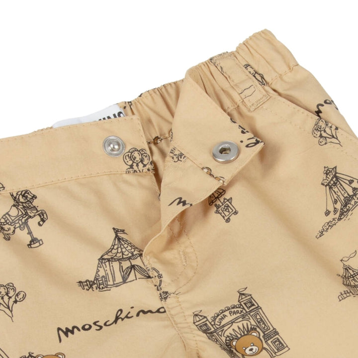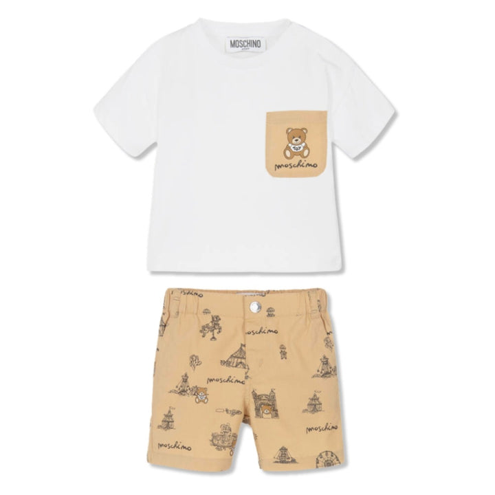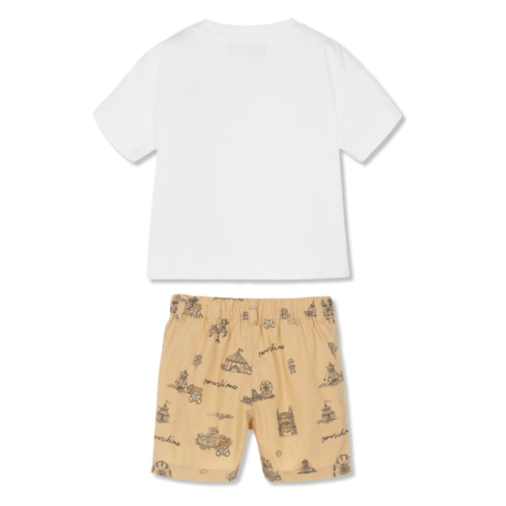 Casual white and beige shorts set for little boys by Moschino. Made in soft cotton, both pieces feature the designer adorable Moschino Teddy Bear. The jersey T-shirt has a chest pocket and shoulder poppers to help with dressing. The poplin shorts are patterned in playful circus-themed prints, with front pockets and a comfortable elasticated waist with a popper fastening.