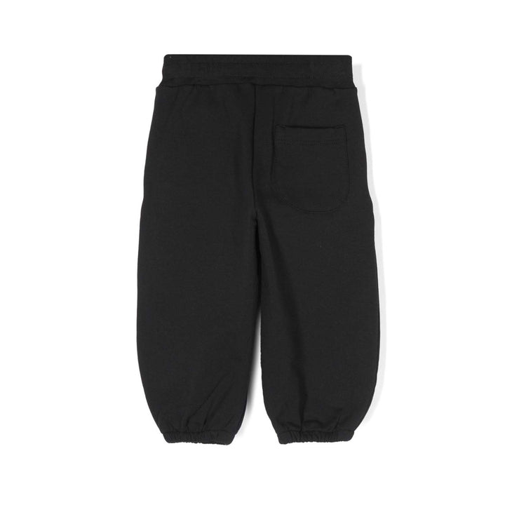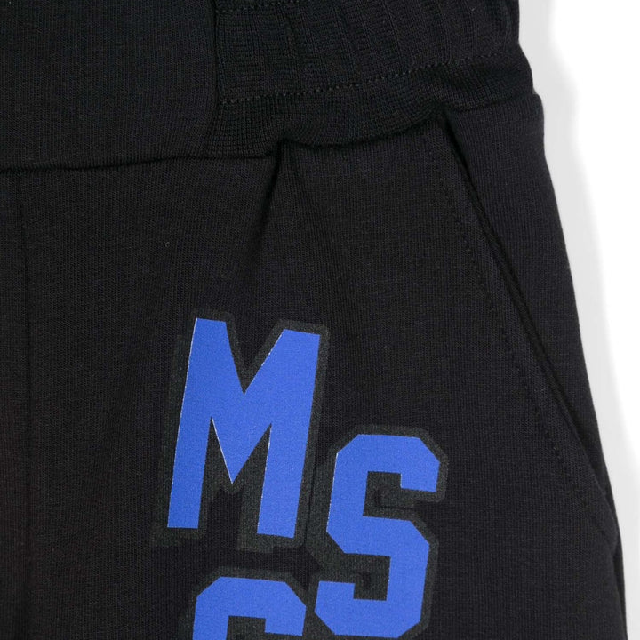 Black joggers for baby boys by Italian label MSGM, made from soft, mid-weight cotton jersey. Warm and fleecy on the inside, these casual joggers have brightly coloured varsity-style logo graphics on the front for a cool, sporty look. They have slante