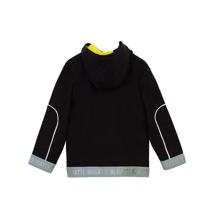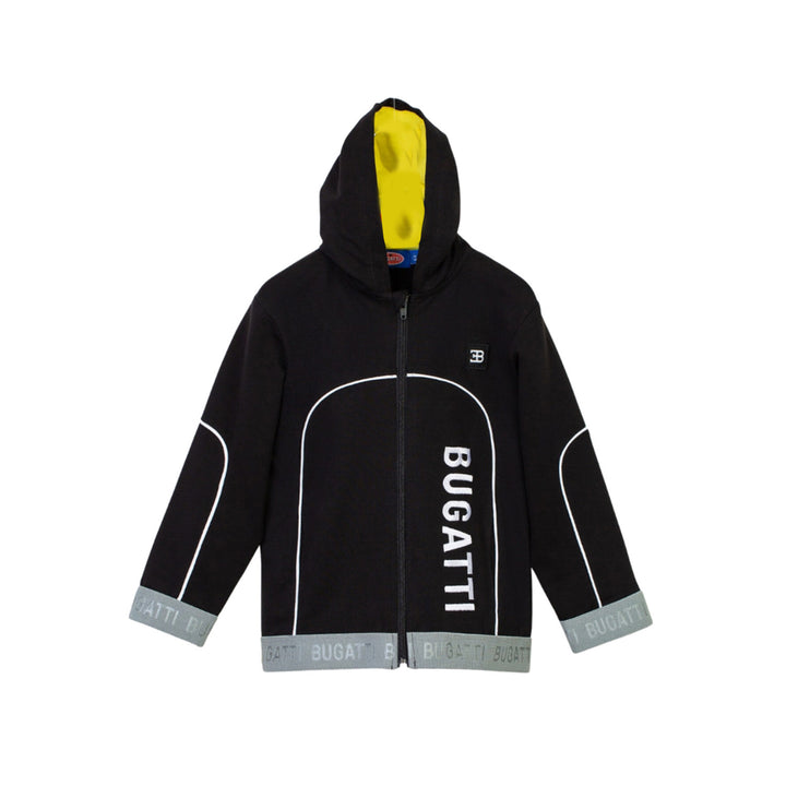 Black zip-up hoodie with a striking yellow lining and sporty contrast piping on the sleeves and body. The front features a full zip fastening, reflective-style trim at the cuffs and hem, and bold vertical BUGATTI branding, making it a stylish and practical outer layer for cooler days.
