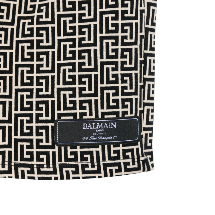 Black jacquard shorts with a labyrinth pattern, elasticated waistband, and front logo patch.