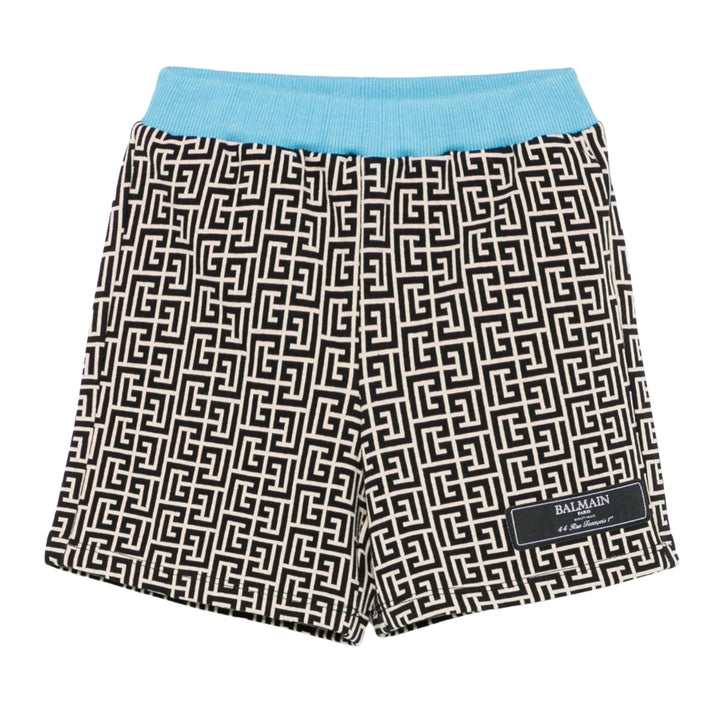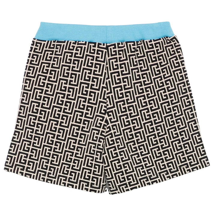 Black jacquard shorts with a labyrinth pattern, elasticated waistband, and front logo patch.