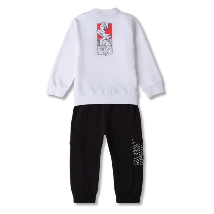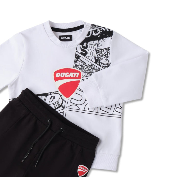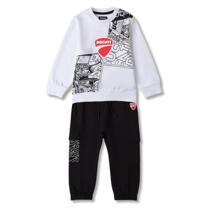 Kids Ducati outfit set featuring a white graphic sweatshirt and black jogger pants with logo detailing stylish and sporty.