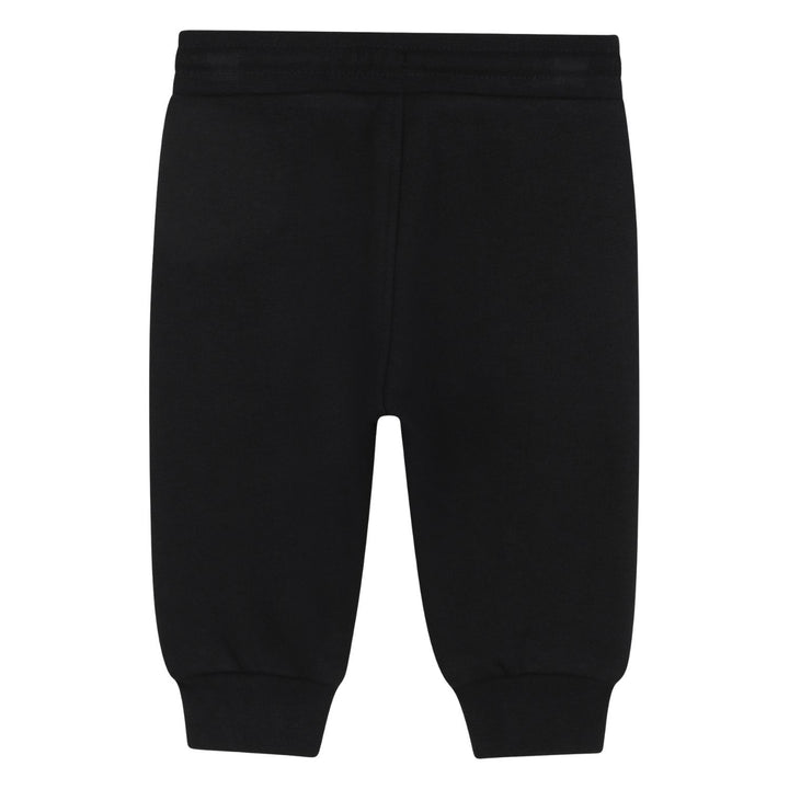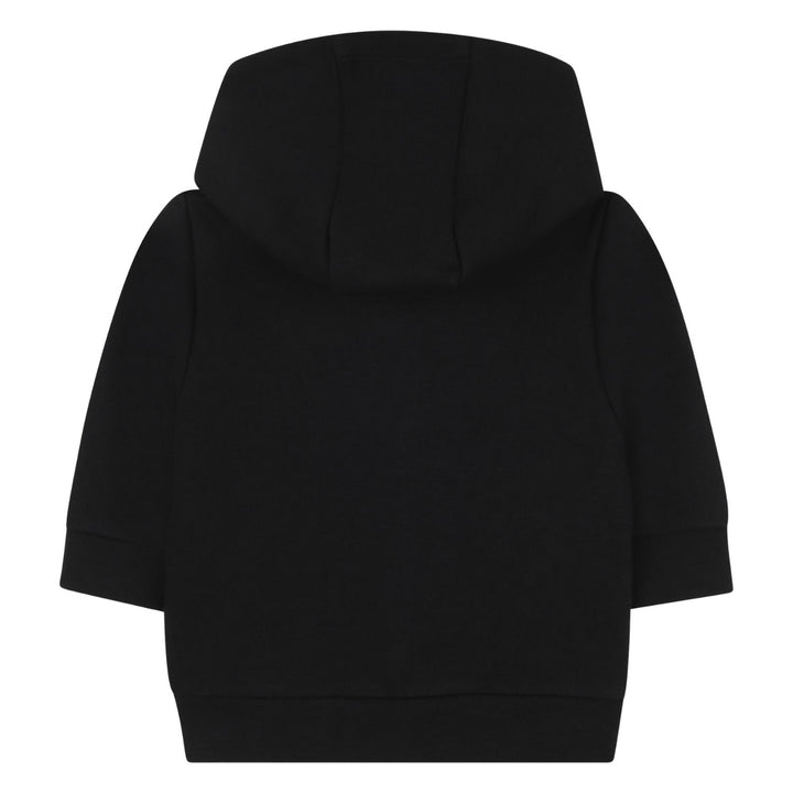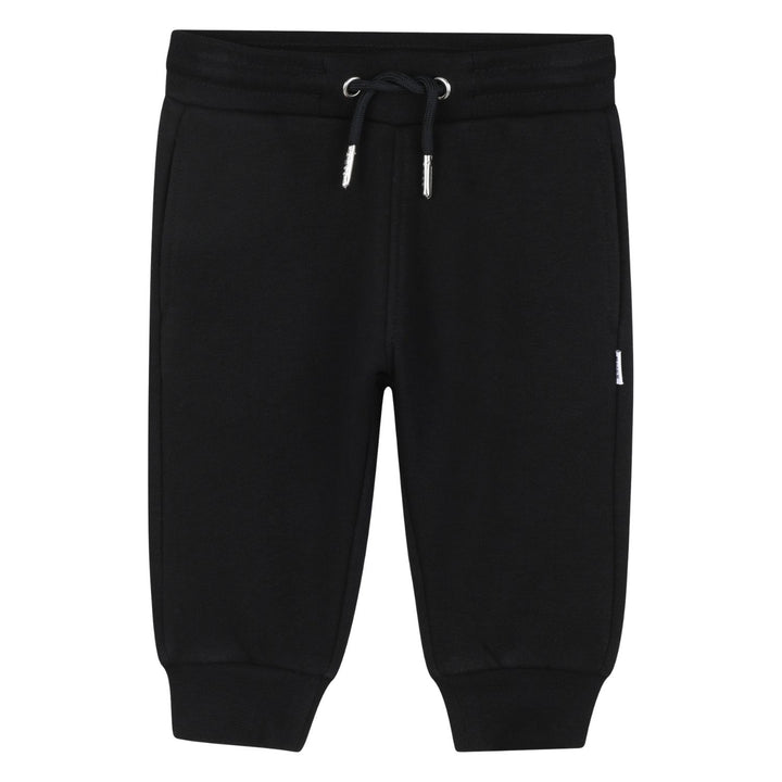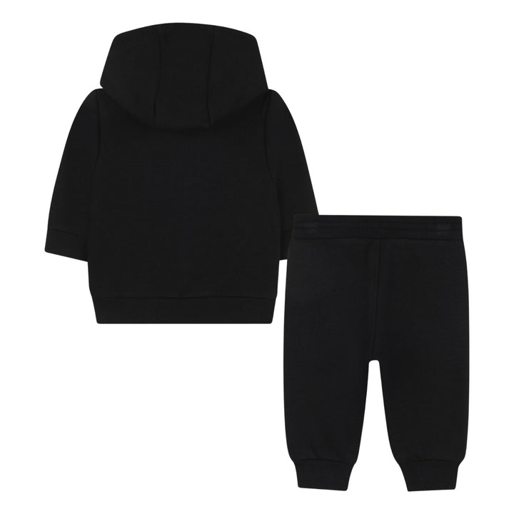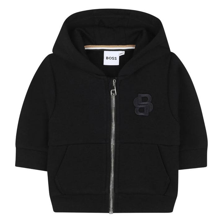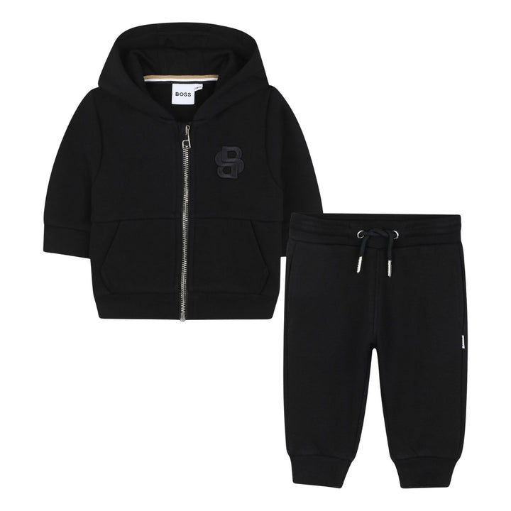 This adorable baby boy's outfit from BOSS includes a black hooded zip-up sweatshirt paired with matching black jogger pants. The sweatshirt features a subtle embroidered logo on the chest with a comfortable hood and front pockets, while the joggers have an elastic waistband with adjustable drawstrings and cuffed ankles for a secure fit. Crafted from soft fabric, this set offers cozy comfort and a sleek, stylish look perfect for casual everyday wear.