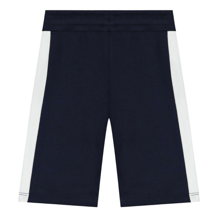 Sporty navy blue cotton shorts for boys by German brand AIGNER, with white stripes on the sides. Bermuda length, they are made in comfortable, lightweight, sweatshirt jersey, and have a ribbed waistband with a logo drawstring for a good fit. There ar