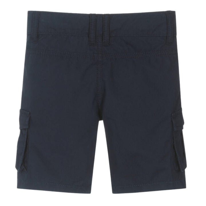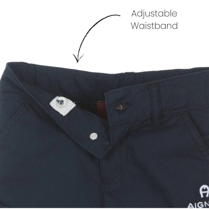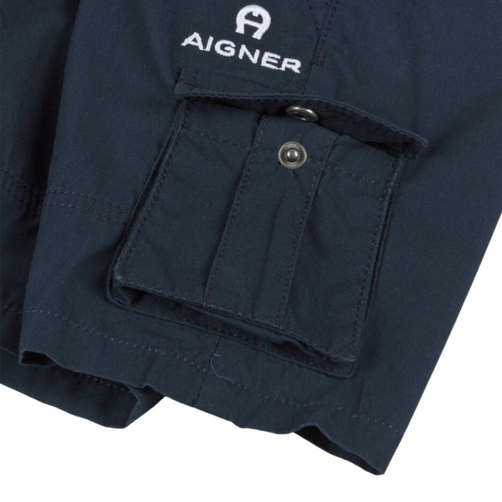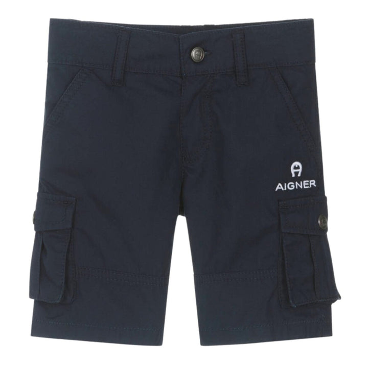 Navy blue Bermuda cargo shorts for baby boys by AIGNER, made in lightweight cotton. Fastening with a branded button, they have an adjustable waist for comfort, slanted front pockets, and popper cargo pockets on each leg. An embroidered navy blue logo