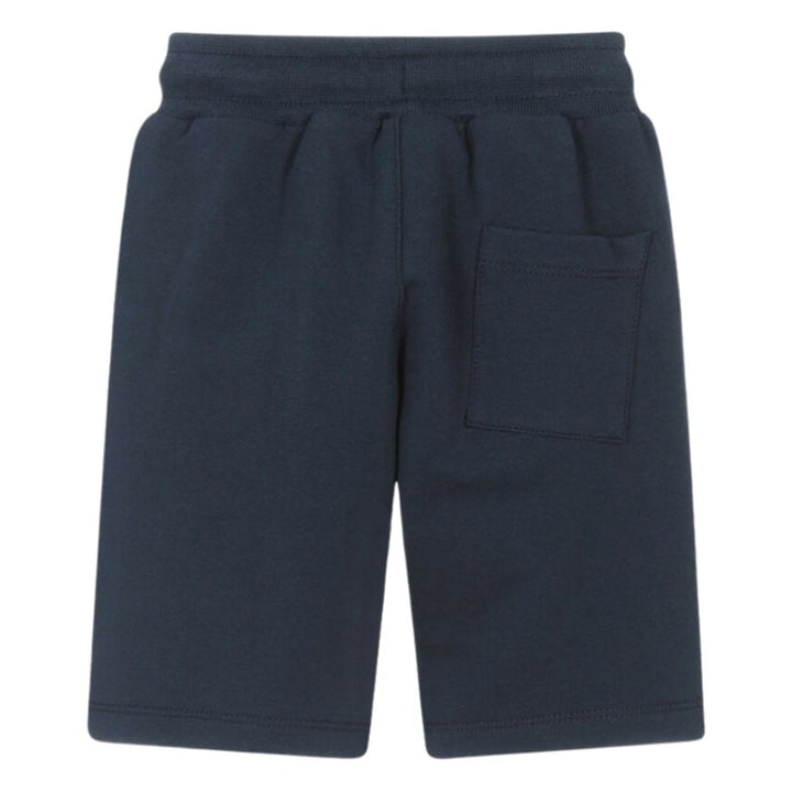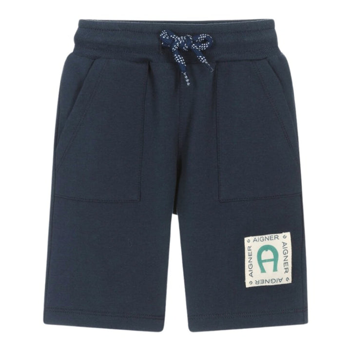 Navy blue cotton Bermuda length shorts for baby boys by German brand AIGNER, made in lightweight sweatshirt jersey. Comfortable for everyday, they have a ribbed waistband with a drawstring for a good fit and useful patch pockets on the front and back
