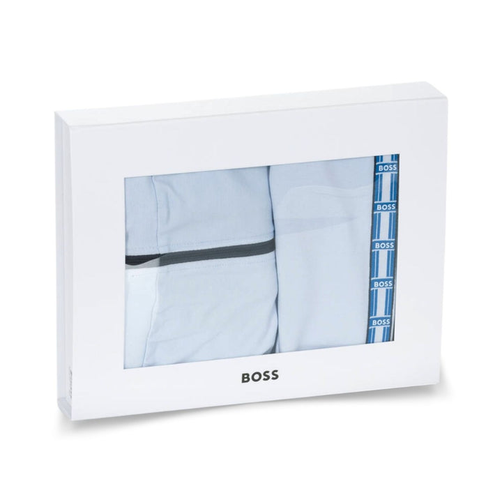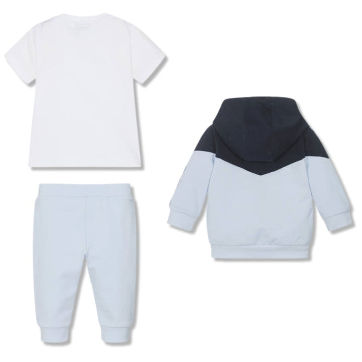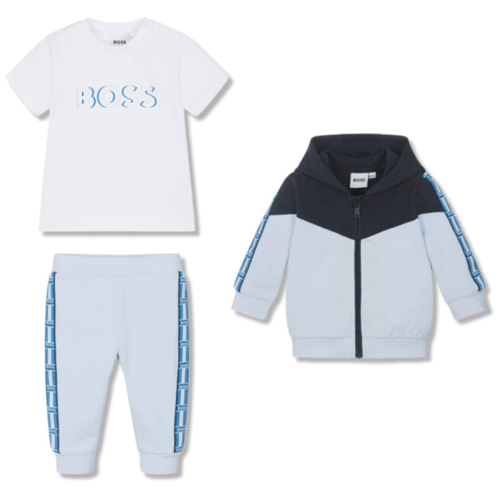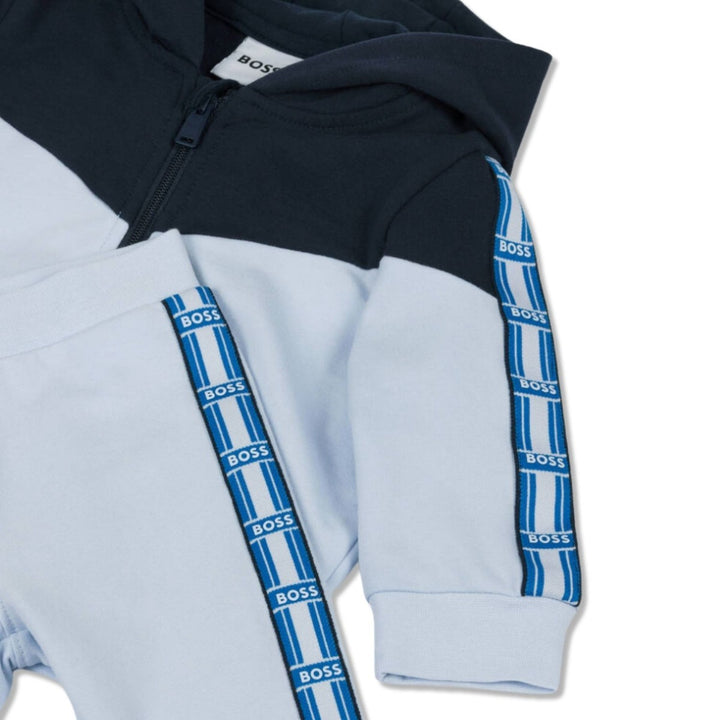 A two-tone blue tracksuit set for baby boys by BOSS, coming in a branded gift box. The tracksuit is made in soft cotton jersey and has logo tape trims for a distinctive look. Completing the outfit is a white cotton T-shirt, with a signature logo on t