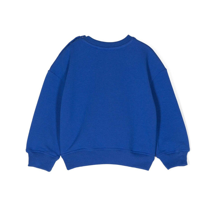 An blue sweatshirt for baby boys from Italian label MSGM, made from soft, mid-weight cotton jersey. Warm and fleecy on the inside, this casual top has lightly ribbed trims and poppers on one shoulder to help with dressing. A brightly coloured varsity-style logo graphic is printed on the front adding a cool, sporty touch.