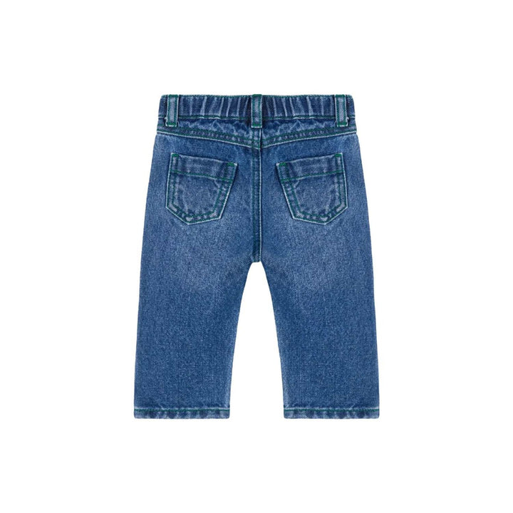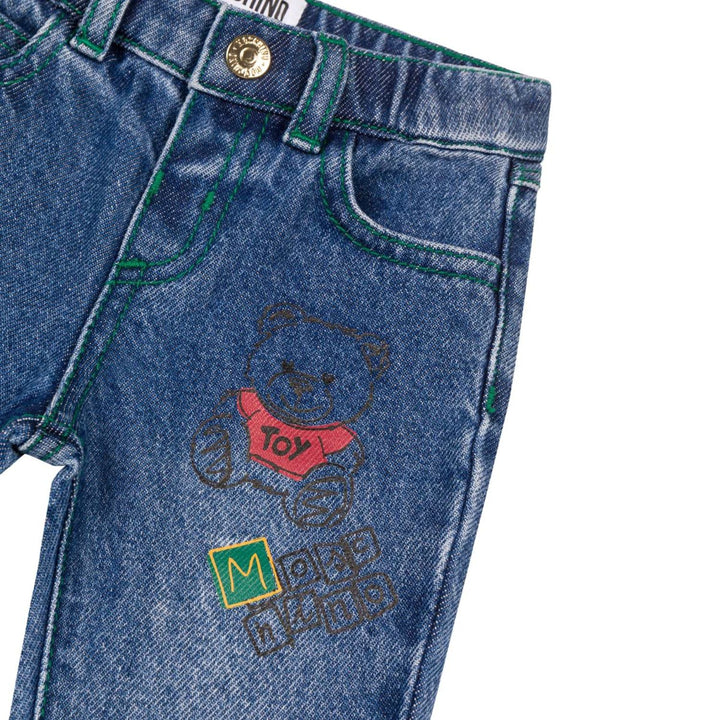 Mid-blue denim jeans for baby boys by Moschino Kid-Teen. They have the iconic Teddy Bear printed on the front for instant brand appeal, along with school-inspired doodles. This classic five-pocket style has green over-stitching and a gold logo button fastening on the waistband, which is adjustable on smaller sizes.