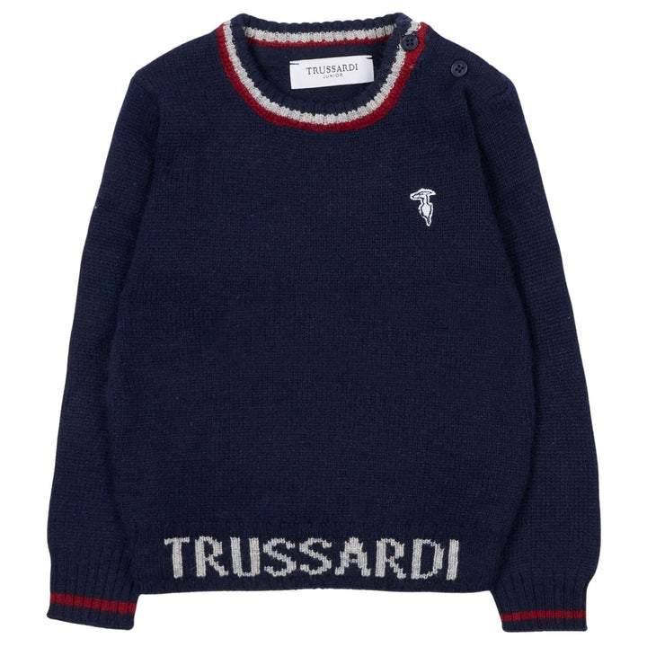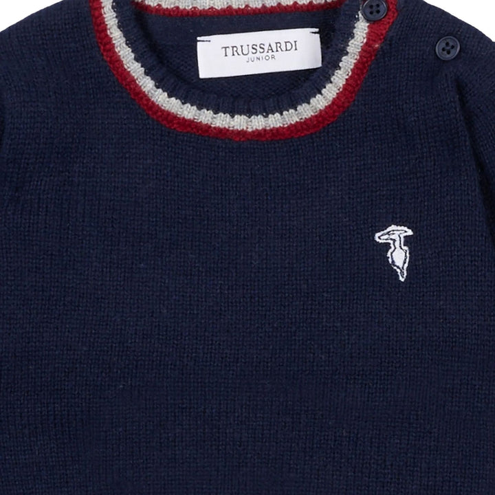 A cozy blue knitted sweatshirt for baby boys featuring a premium embroidered logo on the chest. Made from soft, comfortable fabric perfect for everyday warmth with a classic, stylish look.