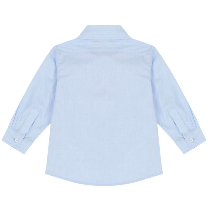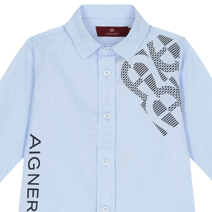 Blue shirt for baby and baby boys by Aigner. Made from soft cotton. It features the brands iconic horseshoe logo and brands name in navy blue print on the front. The shirt has a collared neck, button-down closure, and long sleeves with buttoned cuffs.