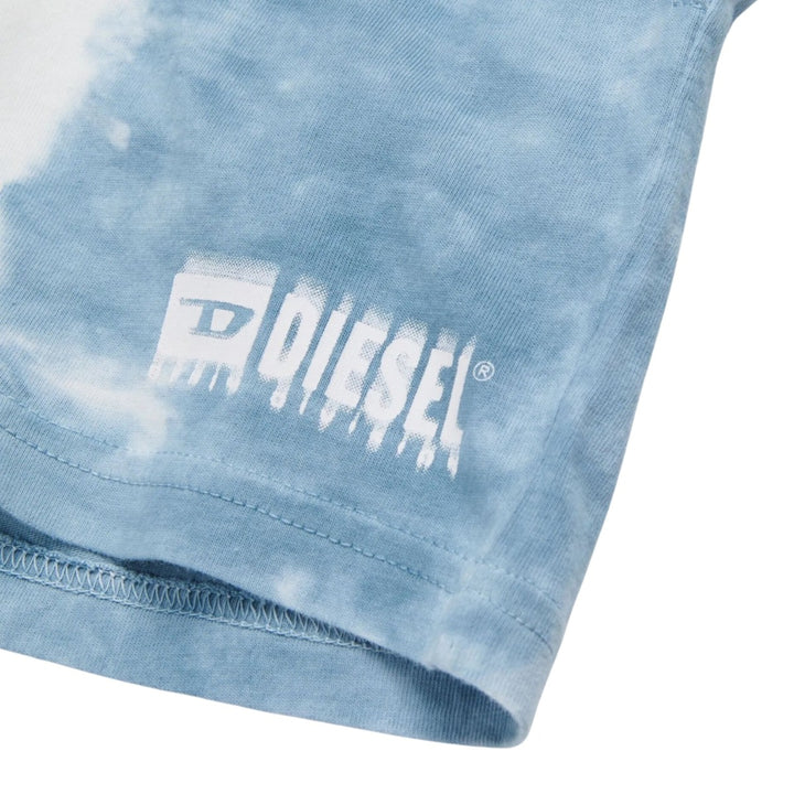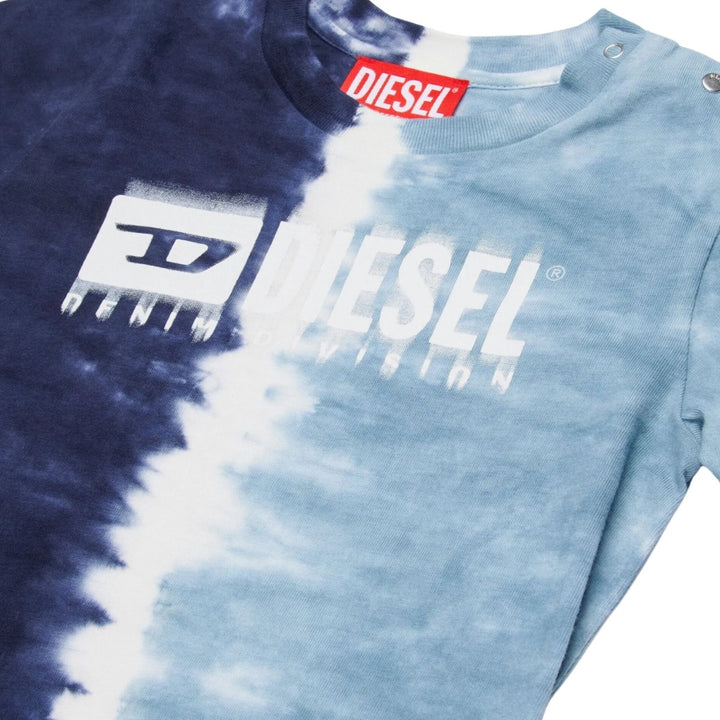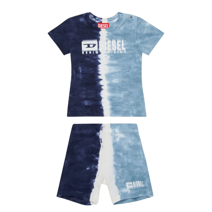 Jersey jumpsuit featuring a three-color gradient effect obtained by manual dip dye construction. Diesel Denim Division logo with degrade effect on the front. Crew-neck T-shirt with short-sleeved sleeves and practical button closure at the shoulder. Shorts with elasticated waist and front welt pockets. Made of 100% cotton.