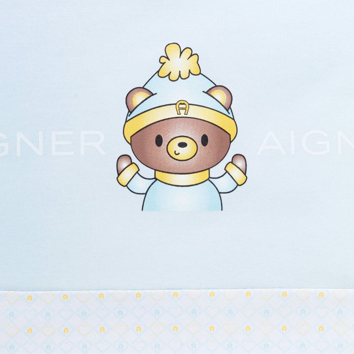 Pale blue nest for baby boys by AIGNER, patterned with a blue logo and teddy bear design. Made in beautifully soft Pima cotton jersey, it is gently padded for warmth and fastens with a zip down one side and across the base. It has a branded fold-down