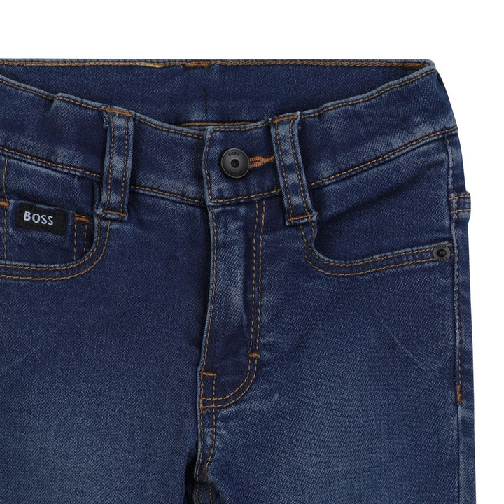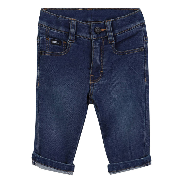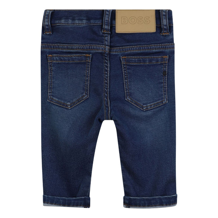 These classic blue jeans from BOSS feature a slim fit cut designed specifically for babies and toddlers. Made from soft, stretch denim, they offer comfort and flexibility for active play. The jeans include traditional five-pocket styling, a logo patch at the coin pocket, and rolled cuffs for a stylish touch. The button and zip closure ensures a secure fit, making these jeans perfect for everyday casual wear.