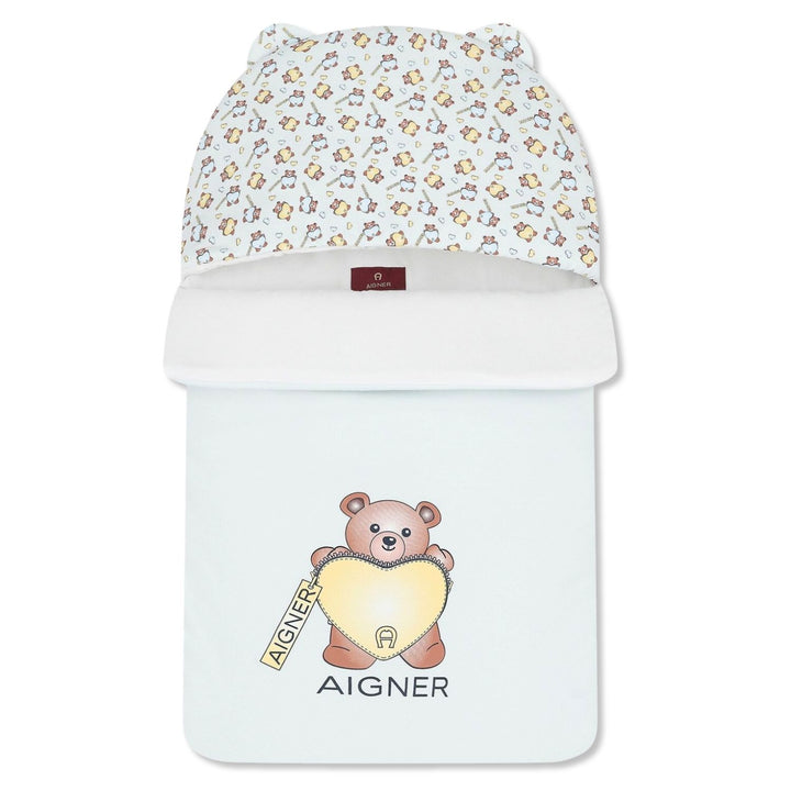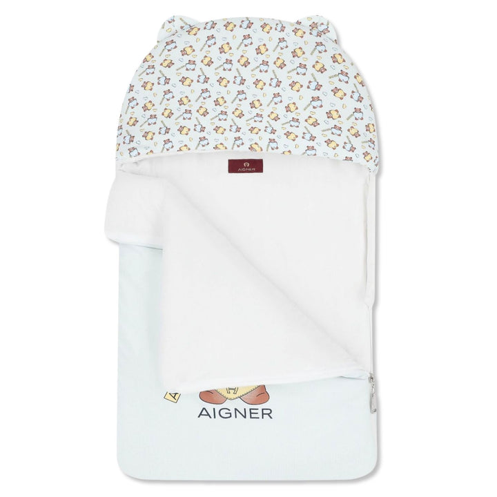 Keep your baby boy cozy and secure with this blue sleep bag from Aigner, featuring the signature teddy bear logo. Made from a soft and stretchy cotton blend, it's perfect for peaceful sleep and gentle snuggles, whether at home or on the go.