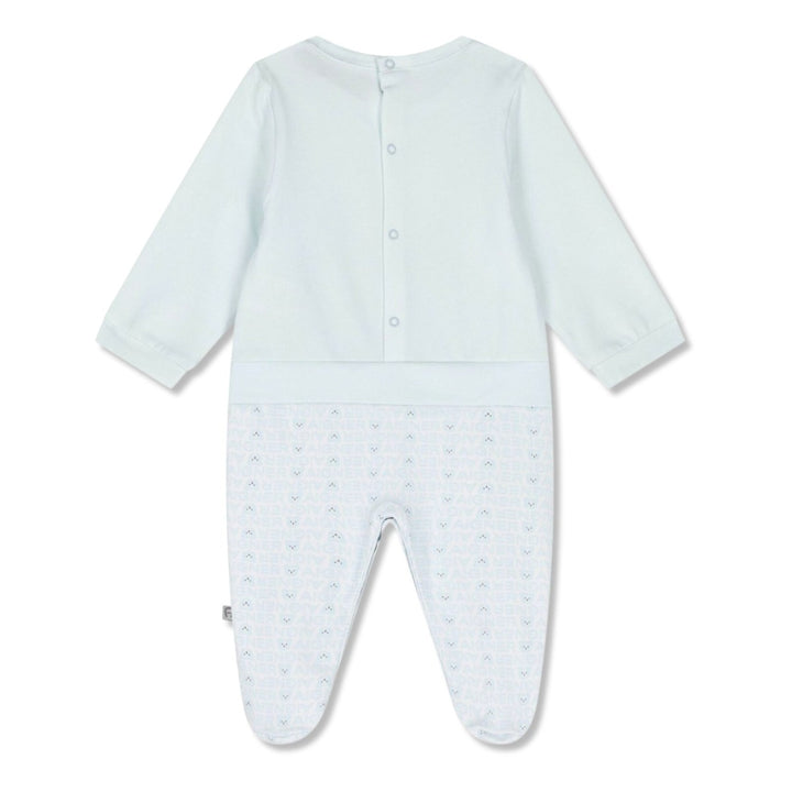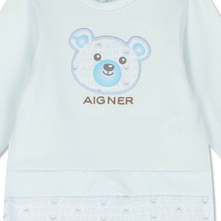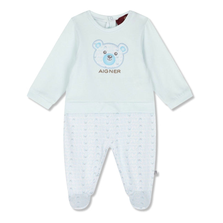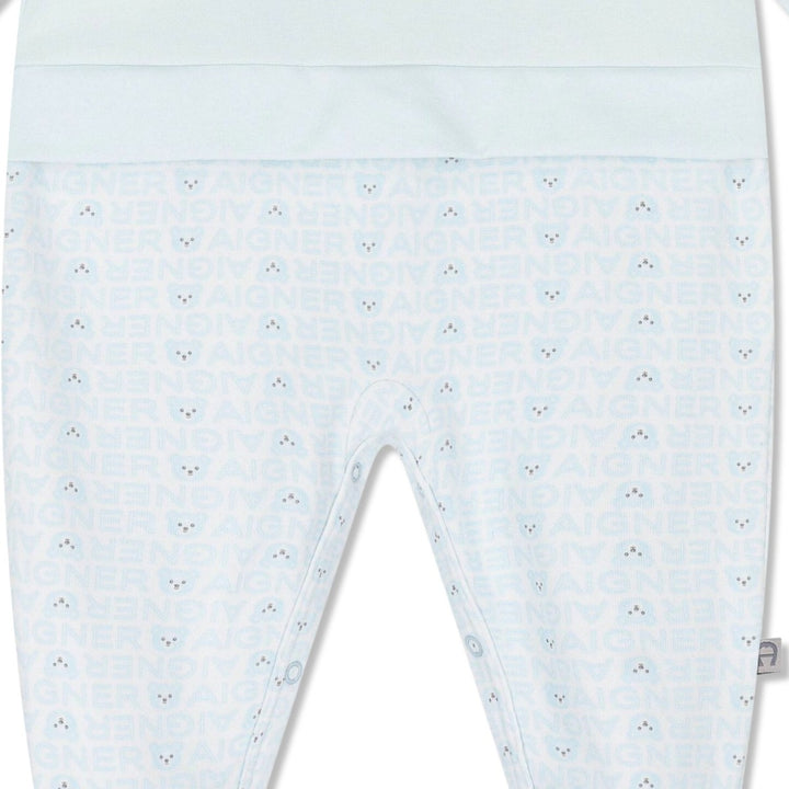 Blue logo teddy bear babygrow for baby boys by Aigner. Made from soft cotton jersey for comfort. The front has a cute teddy bear face applique and embroidered logo, while the bottom is patterned with a repeated pink brands name and teddy bear face print. It fastens with poppers at the back and between the legs for easy dressing. Matching items are available to purchase separately.