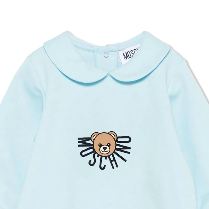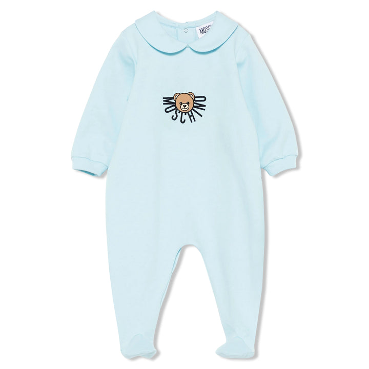 Snuggle time meets playful charm with these adorable teddy bear-print pajamas from Moschino Kids. Made from 1% soft cotton in classic white, this cozy one-piece features long sleeves, footed legs for added warmth, and easy snap fastening. The signatu
