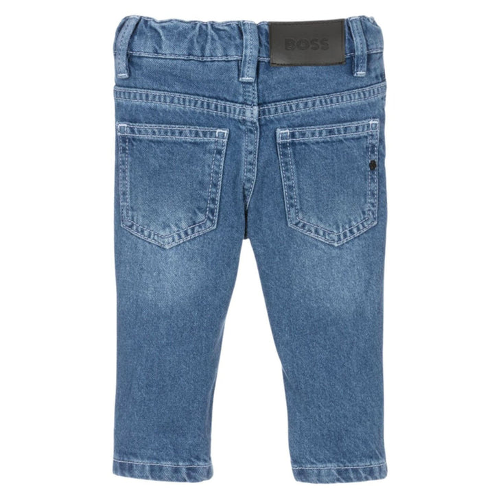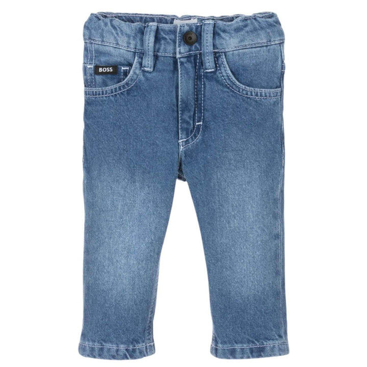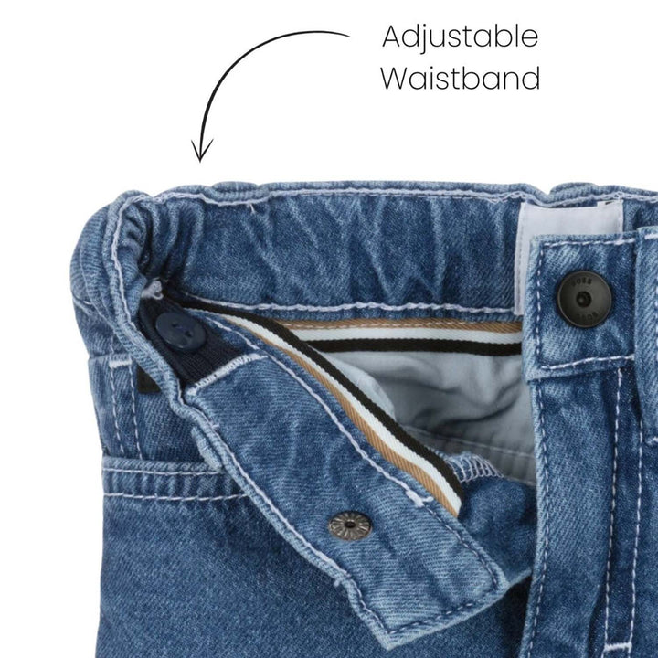 Mid-wash blue jeans for little boys by BOSS, made in non-stretch cotton denim. In a comfortable regular fit, they have an adjustable waist and fasten with a branded clip and zip. They are styled with five pockets and have a jacron logo patch and a sm