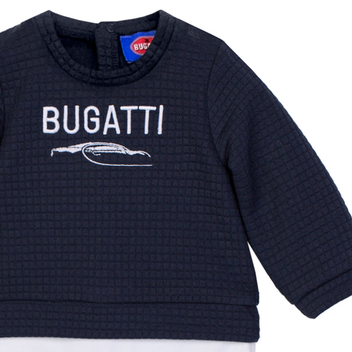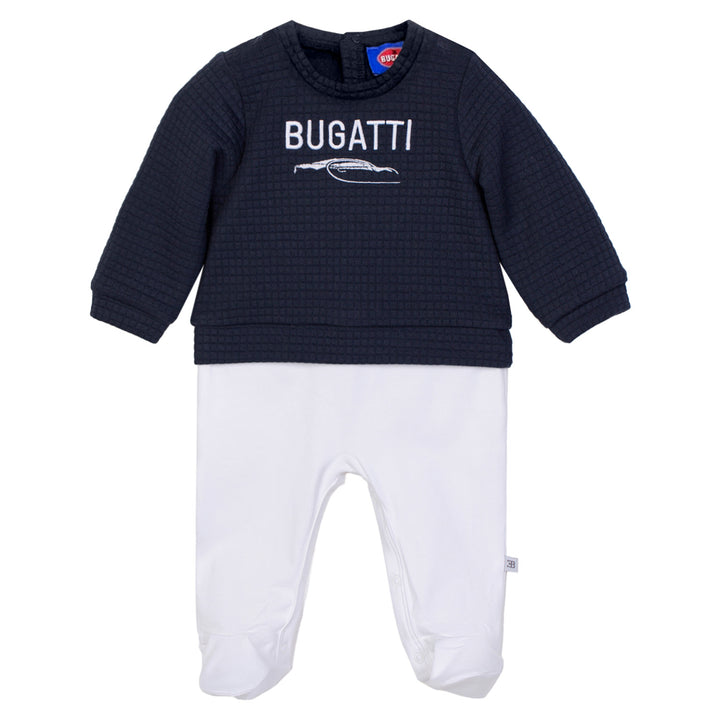 This blue and white romper features a delicate embroidered logo on the chest. Crafted from soft cotton with snap buttons for easy changes and all-day comfort.