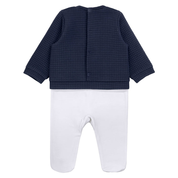 This blue and white romper features a delicate embroidered logo on the chest. Crafted from soft cotton with snap buttons for easy changes and all-day comfort.