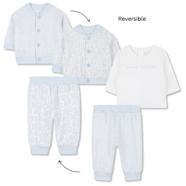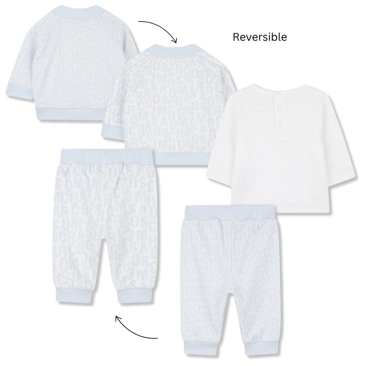 Marc Jacobs Baby Boys Blue & White Reversible Tracksuit offers versatile style with a playful design. Made for comfort and ease, it is perfect for active days and keeps your little one looking adorable.