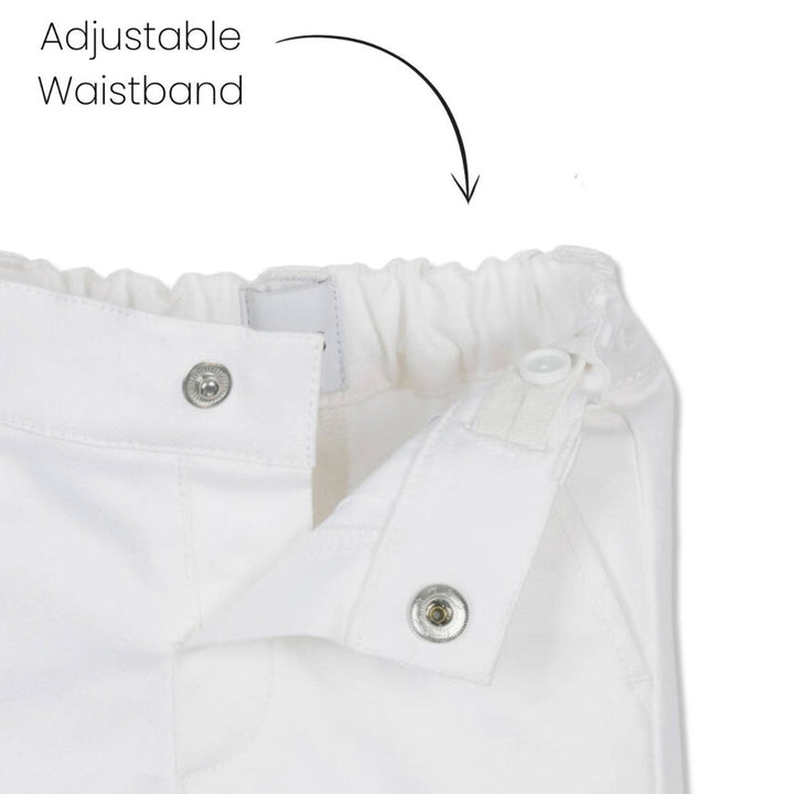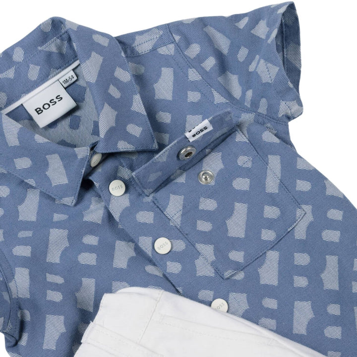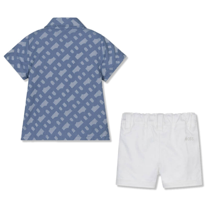 A smart-casual cotton twill shorts set for baby boys by BOSS. In a jacquard monogram design, the blue shirt has branded popper fastenings and a logo tab on the chest pocket. The white shorts have slanted front pockets and an elasticated adjustable wa