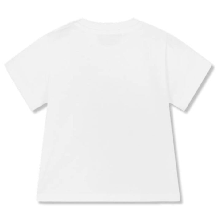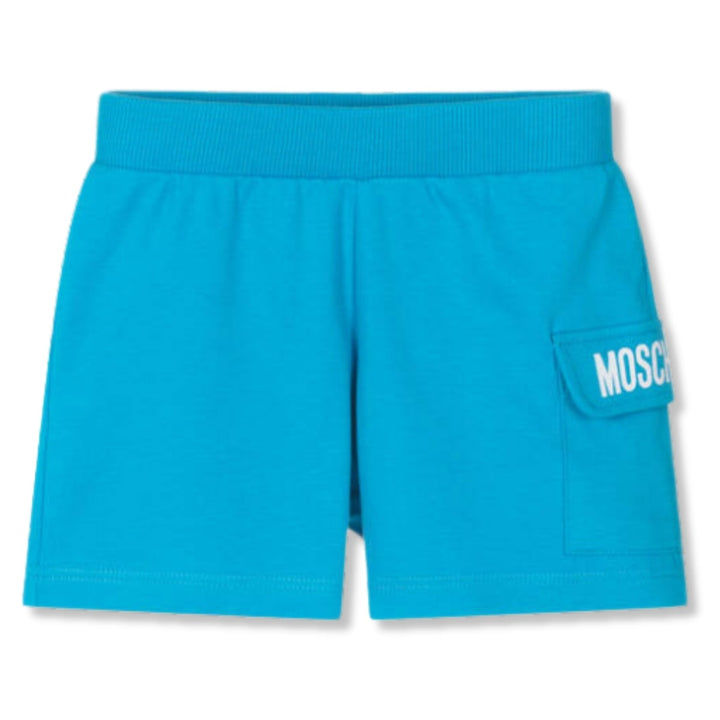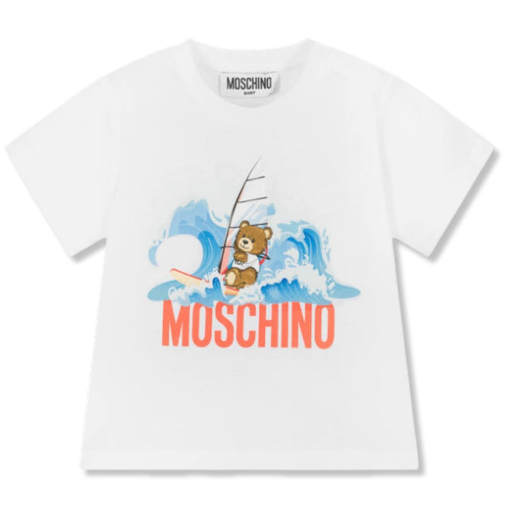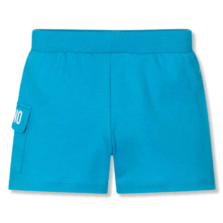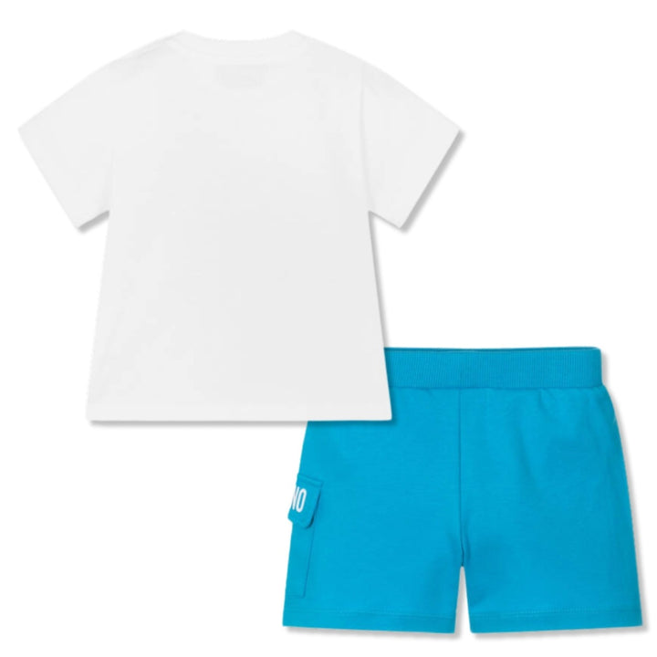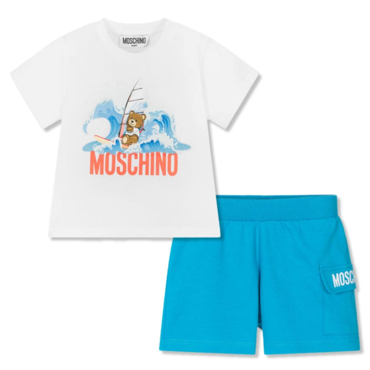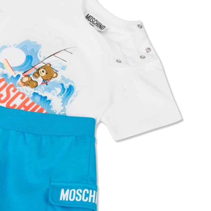 Little boys blue and white shorts set by Moschino, made in comfortable cotton jersey. This outfit set includes a white T-shirt, illustrating the brand's playful Teddy Bear surfing through the waves. The vibrant blue shorts have a stretchy ribbed waistband and a branded pocket on the leg.